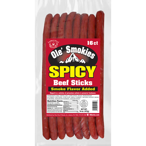 Buffalo Bills 16-ct Bulk Ole' Smokies are a premium "twist-end" beef stick with a great, old-fashioned flavor and quality. Made in the USA with 100% US-raised beef, each 16oz pack contains 16 unwrapped 1oz 9” sticks. Buffalo Bills 16-ct Bulk Ole' Smokies are available in 5 popular flavors - Chipotle Habanero, Honey Stung, Mild, Spicy, and Teriyaki.